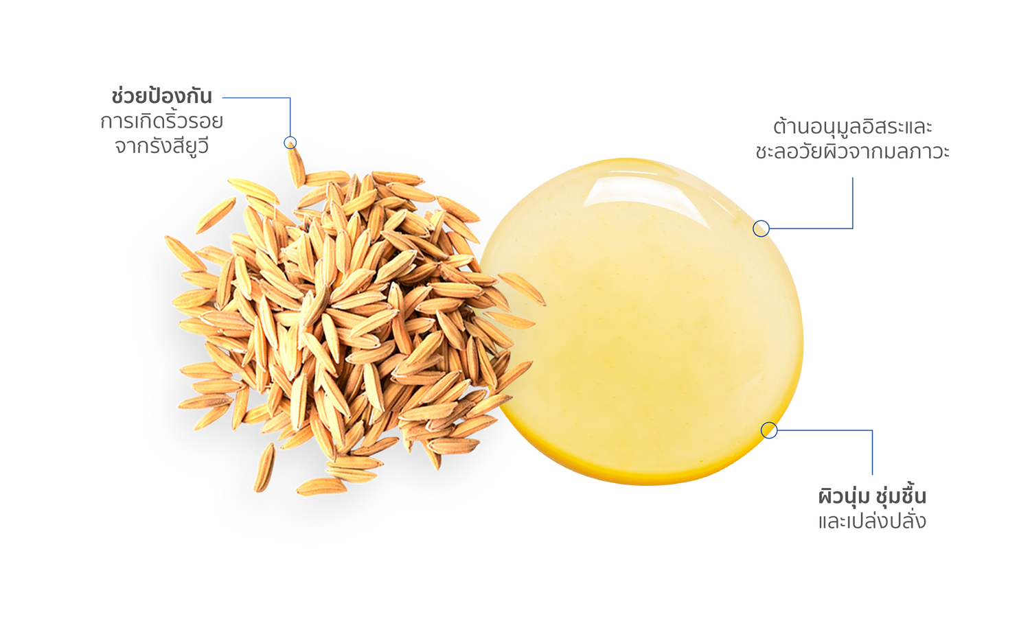น้ำมันสกัดจากรำข้าว มีสารแกมมาโอรีซานอล ( Gamma Oryzanol) ซึ่งเป็น สารต้านอนุมูลอิสระธรรมชาติ ที่ช่วยยับยั้งการสร้างเม็ดสีบริเวณผิวหนังและป้องกันการเกิดริ้วรอยจากรังสียูวี อีกทั้งยังมีวิตามิน E ในรูปแบบของ โทโคฟีรอล (Tocopherols) และโทโคไตรอีนอล (Tocotrienols)ที่ทำงานร่วมกับสารสควอลีน (Squalene)ให้ผิวนุ่ม ชุ่มชื้น และเปล่งปลั่ง